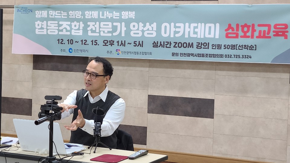 2020년 협동조합 전문가 양성 아카데미 심화교육 1일차 교육이 12월10일 오후 1시에 제물포스마트타운 13층 세미나실에서 ZOOM 강의로 시작되었습니다. 이번 심화교육은 년말 회계 결산과 연초 개최하는 총회준비 등 협동조합 운영에 꼭 필요한 강의로 기획되었습니다. 제1회 강의는 '회계 결산 및 감사보고'로 세무법인 이든의 대표이신 조현행 세무사님이 해주셨고, 이어서 제2회 강의는 '총회준비 및 사업계획 수립'으로 인천사회적경제지원센터 송영석 센터장님이 해주셨습니다. ZOOM 강의라 비대면으로 진행되어 아쉬운 점이 많았지만 협동조합을 하시는 여러분께 조금이라도 도움이 되셨기를 바랍니다. 감사합니다. 사무국장 한미희